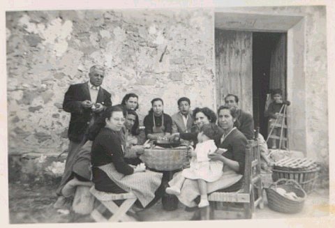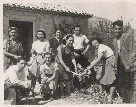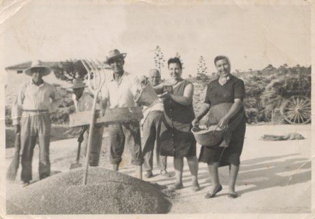 Mi abuelo Jesús Aroca (en el centro, al fondo), mi madre y sus tíos garbillando el trigo en la era que tenían más arriba de "El Boquerón"