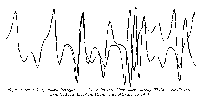 Un día en 1961, quería ver una secuencia en particular de nuevo. Para ganar tiempo, comenzó a mitad de la secuencia, en lugar de en el principio. Introdujo los números de su copia impresa y lo dejó ejecutando. Cuando volvió una hora más tarde, la secuencia había evolucionado de forma distinta. En lugar de obtener el mismo patrón de antes, divergía del patrón original finalizando de una forma muy distinta. (Ver figura 1.). Finalmente comprendió lo que había sucedido. El ordenador almacenó seis decimales en su memoria. Al guardarlo en papel, sólo imprimió tres decimales. En la secuencia original, el número era 0,506127, y sólo había escrito los tres primero dígitos, 0,506.