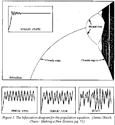 Un biólogo, Robert May, decidió ver qué sucedía con las ecuaciones cuando cambiaba el valor de la tasa de crecimiento. A valores bajos de tasa de crecimiento, la población se establecería en un único número. Por ejemplo, si la tasa de crecimiento es 2,7, la población se establecerá en 0,6292. Cuando se incrementa la tasa de crecimiento, la población final se incrementaría también. Entonces, sucedió algo extraño. Tan pronto como la tasa de crecimiento pasaba de 3, la línea se rompía en dos. En lugar de establecerse en una única población, saltaría entre dos poblaciones distintas. Tendría un valor para un año, otro para el siguiente, repitiendo el ciclo para siempre. Incrementar la tasa de crecimiento un poco más provocó que saltara entre cuatro valores distintos. Cuando el parámetro crecía aún más, la línea se bifurcaba de nuevo. Las bifurcaciones llegaban más y más rápidamente hasta que de pronto, aparecía el caos. Pasada una cierta tasa de crecimiento, se hacía imposible predecir el comportamiento de la ecuación. Sin embargo, bajo una inspección más detallada, es posible ver líneas claras. Mirando más de cerca, estas líneas revelan pequeñas ventanas de orden, donde la ecuación va a través de las bifurcaciones de nuevo antes de volver al caos. Esta auto-similitud, el hecho de que el gráfico tenga una copia exacta de sí mismo oculta en su interior, viene a ser un aspecto importante del caos.