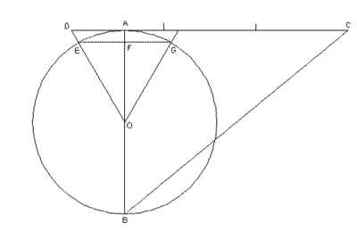 Se dibuja una circunferencia de radio R. Dentro de ella se inscribe un hexágono y se toma el triángulo OEG. Se traza una paralela al segmento EG que pase por A, prolongándola hasta que se corte con el segmento OE, obteniendo D. Desde el punto D y sobre ese segmento se transporta 3 veces el radio de la circunferencia y se obtiene el punto C. El segmento BC es aproximadamente la mitad de la longitud de la circunferencia.