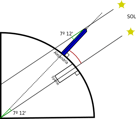 Eratóstenes realizó observó que, en Alejandría, el mismo día y a la misma hora no se producía este mismo hecho. Asumió de manera correcta que el Sol se encontraba a gran distancia y que sus rayos, al alcanzar la tierra, lo hacían en forma (prácticamente) paralela. Esto ratificaba su idea de que la superficie de la Tierra era curva pues, de haber sido plana, no se hubiese producido esta diferencia entre las dos ciudades. El siguiente paso fue medir en Alejandría el ángulo que formaban los rayos del sol con la vertical que por construcción es igual al ángulo cuyo vértice está en el centro de la Tierra (ver gráfico superior). Este ángulo resulto ser de 7º 12' ( = 7'2º) que unido al hecho conocido de que la distancia entre las dos ciudades era de 5.000 estadios, dieron como conclusión que la circunferencia de la Tierra medía 360·5000/7'2; es decir, 250.000 estadios. Aunque no se tienen datos exactos, se sabe que el estadio equivale a unos 160m (actualmente se suele tomar 158m). Por tanto, 250.000 estadios son aproximadamente 250.000*160/1000 = 40.000 Km. Esto equivale a un radio de 6.366 Km. o 6.286 si tomamos los 158m, contra los 6.371 Km. que son los admitidos hoy en día.
